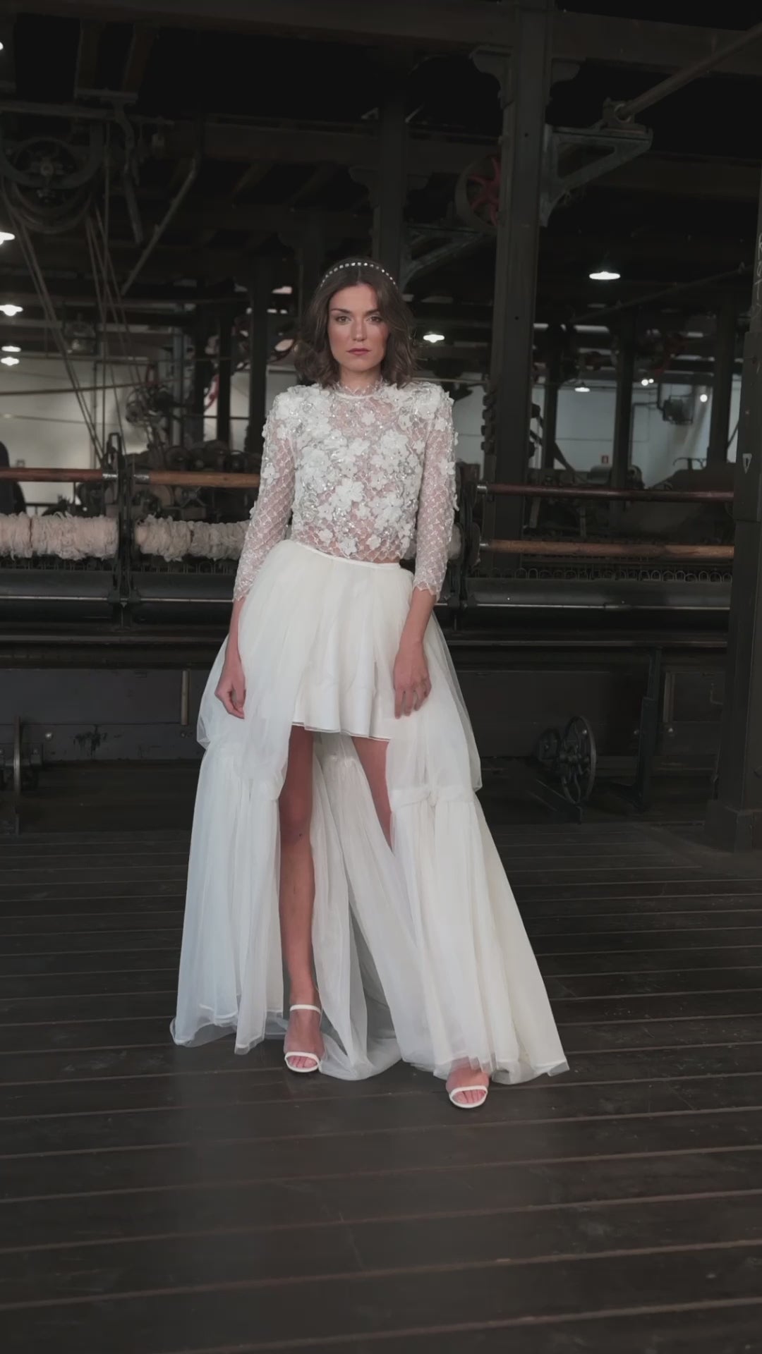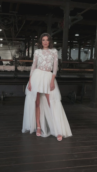 Top Joya confeccionado en pedrería con aplicaciones 3d y falda de tul abullonada con mini falda interior.