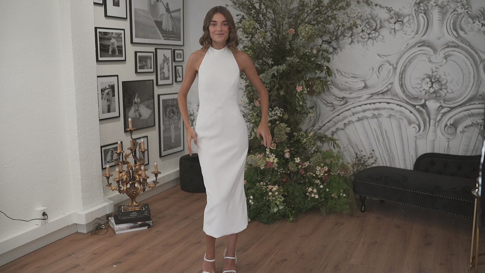 Straight line dress with halter neckline, open back, midi length in crepe with taffeta back bow, 3D effect embroidered organza skirt. Combines with the Camille Skirt.