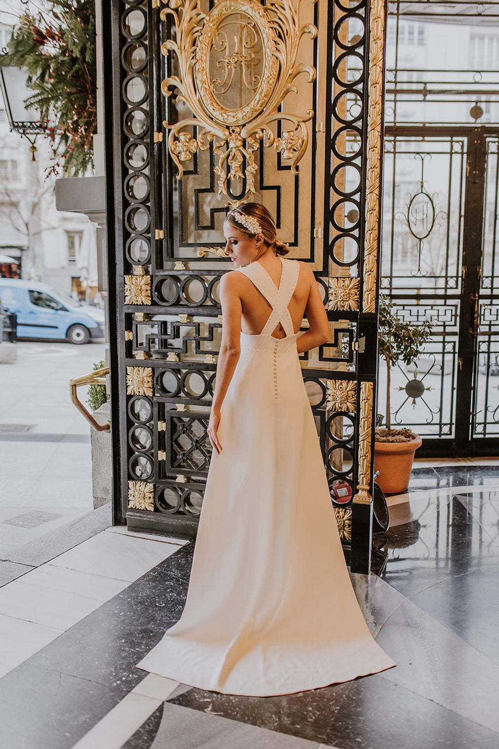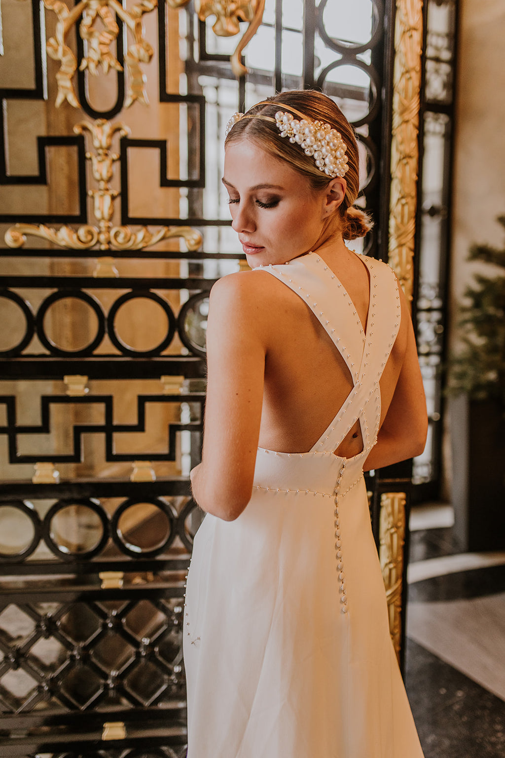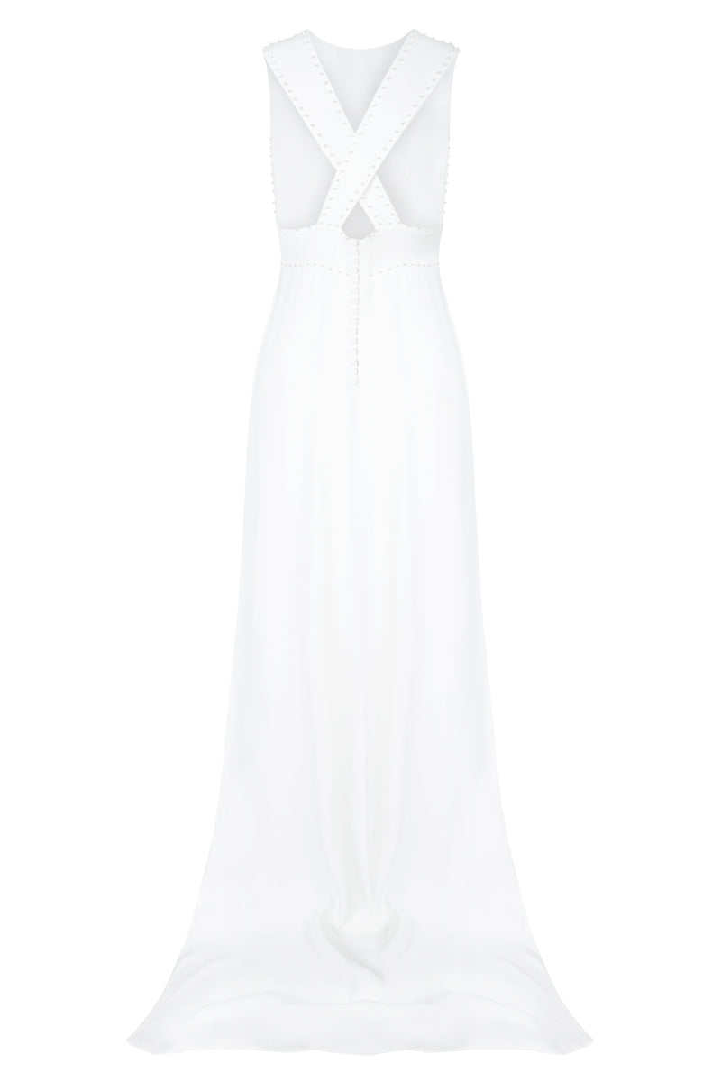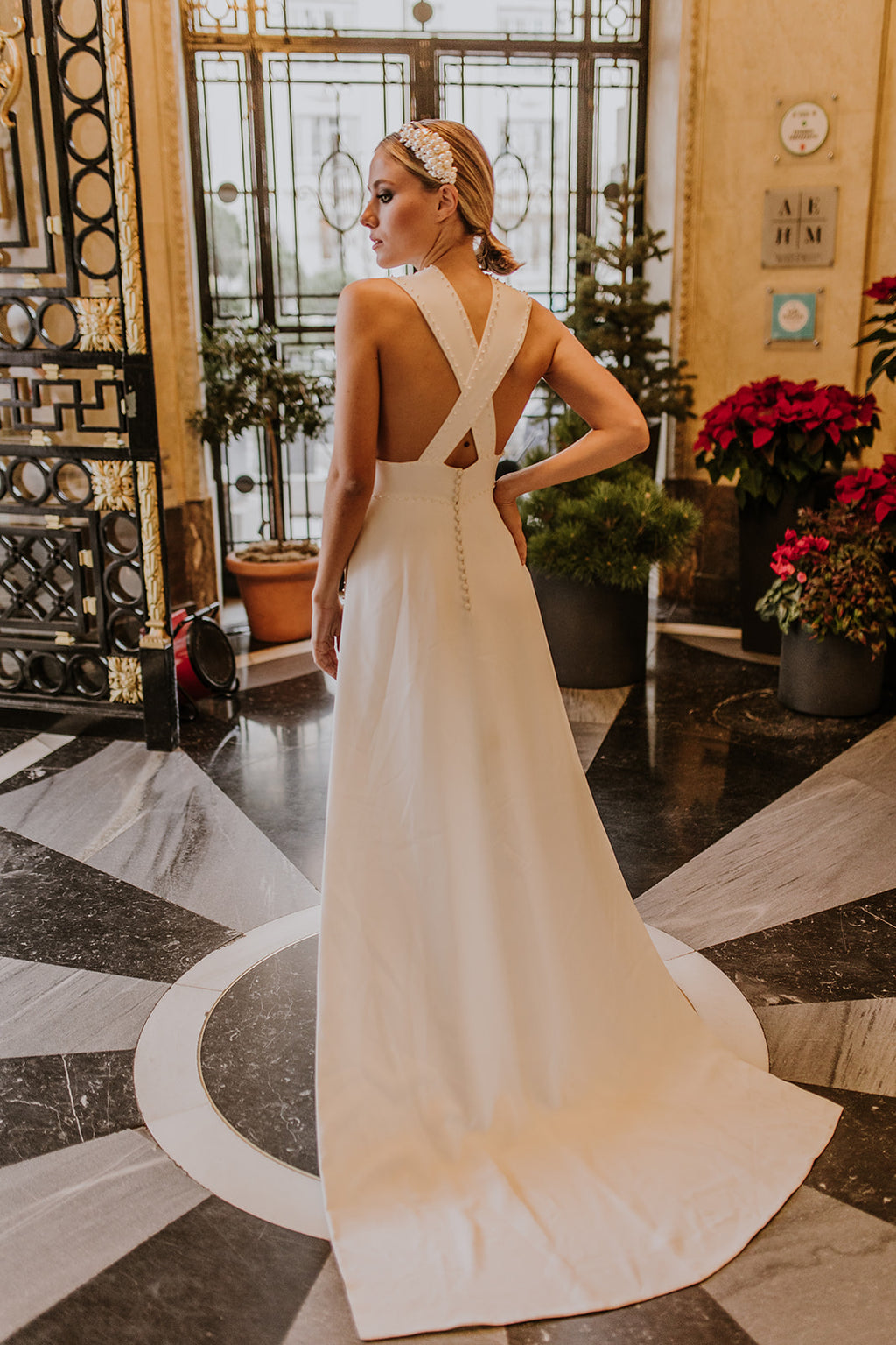 Vestido confeccionado en crepe con perlas bordadas a mano. Espalda cruzada y cola con opción de desmontar.