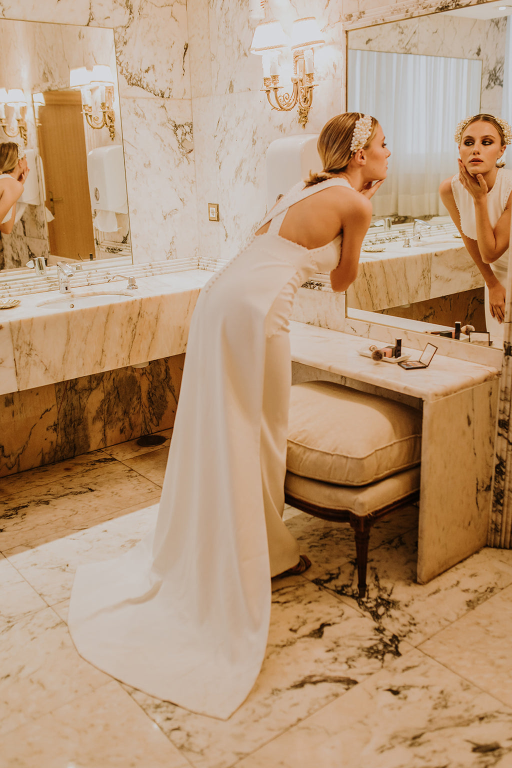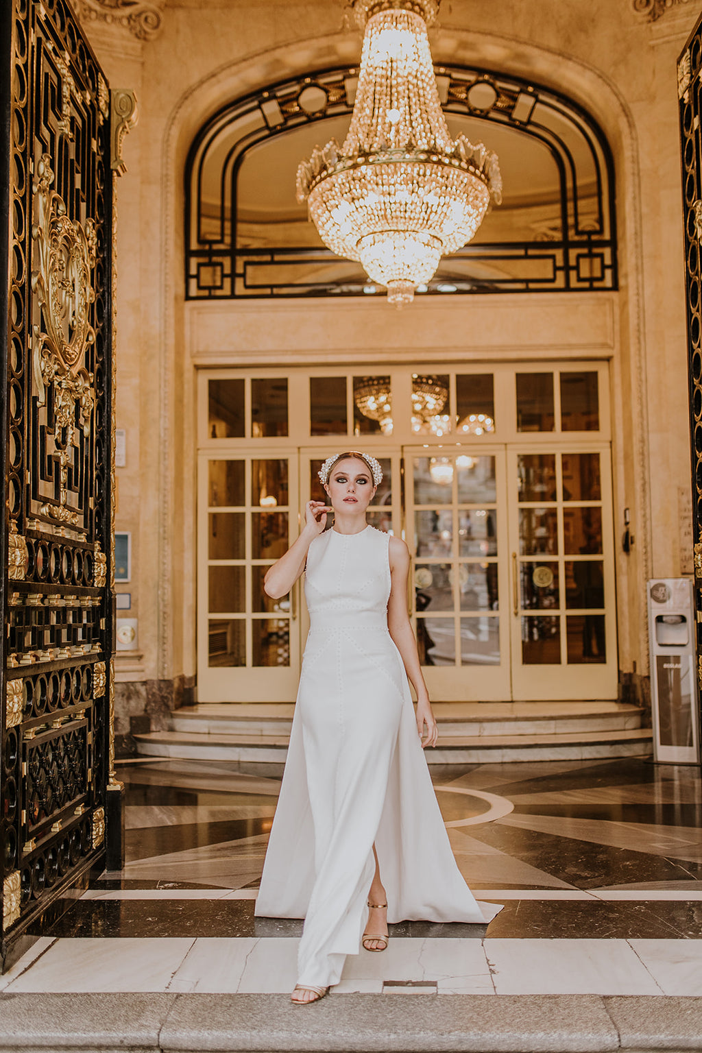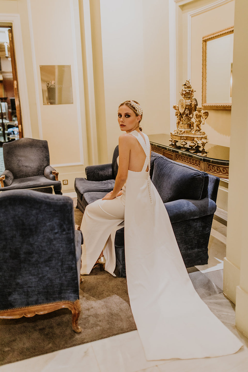 Vestido confeccionado en crepe con perlas bordadas a mano. Espalda cruzada y cola con opción de desmontar.