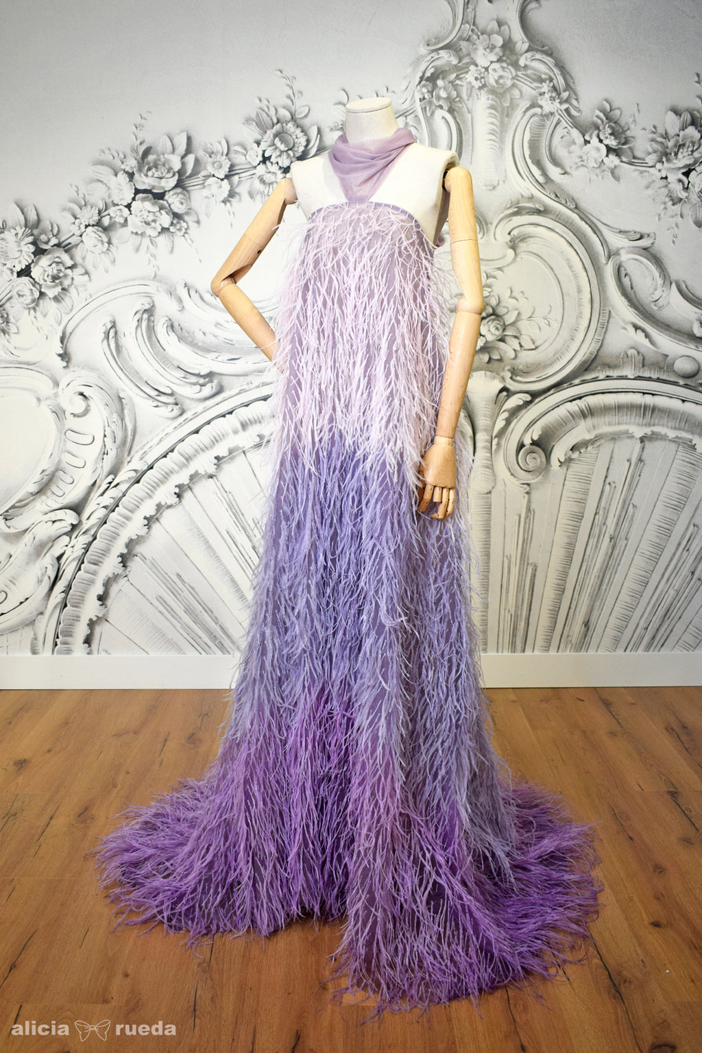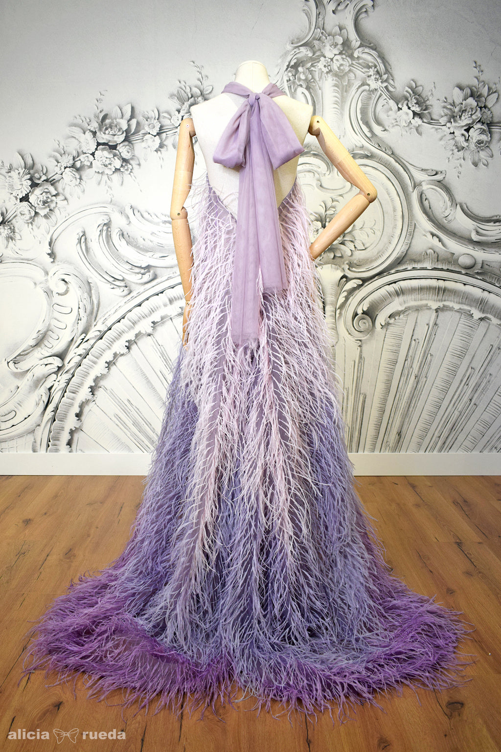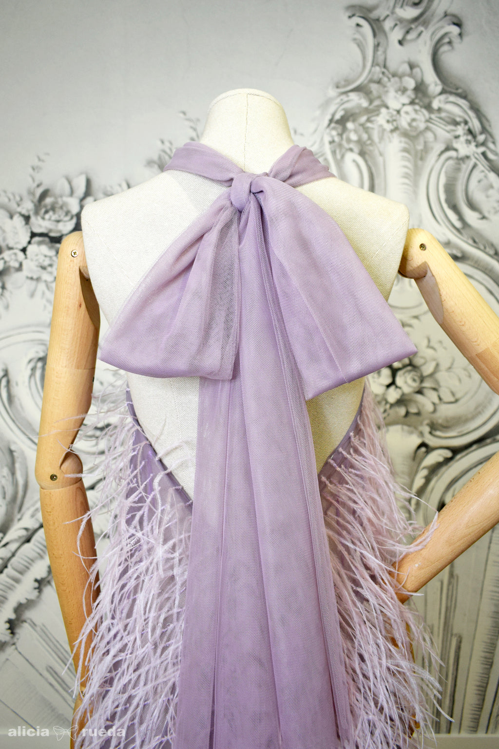 Vestido confeccionado en  pluma con cuello halter y espalda descubierta.