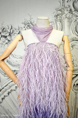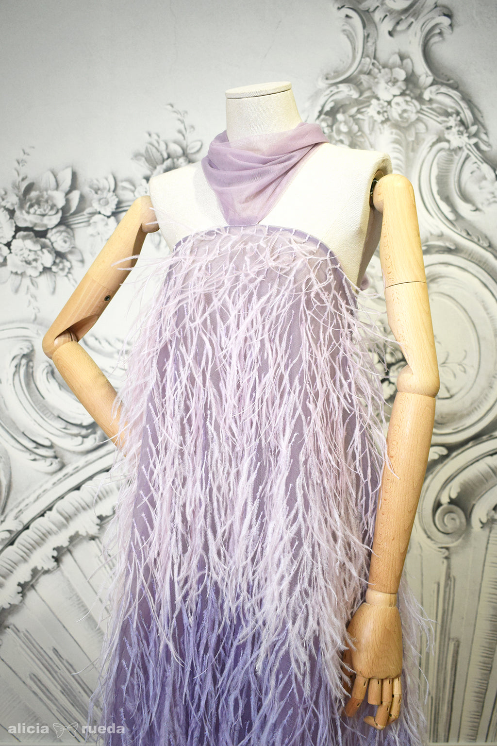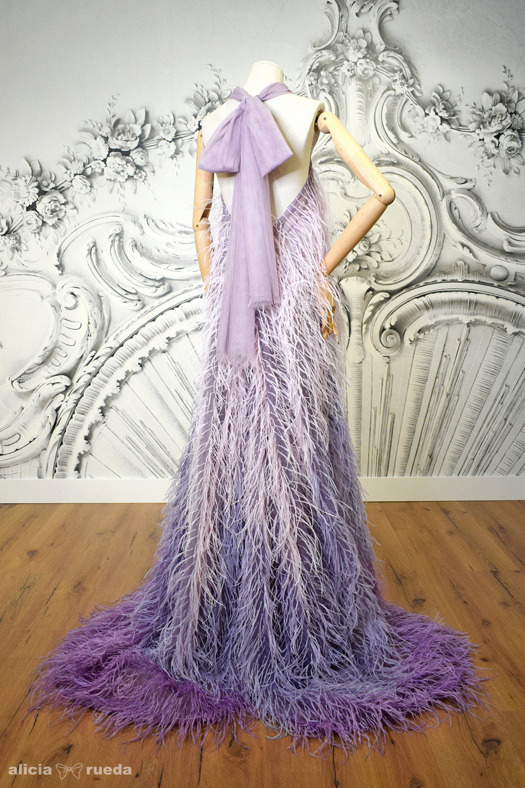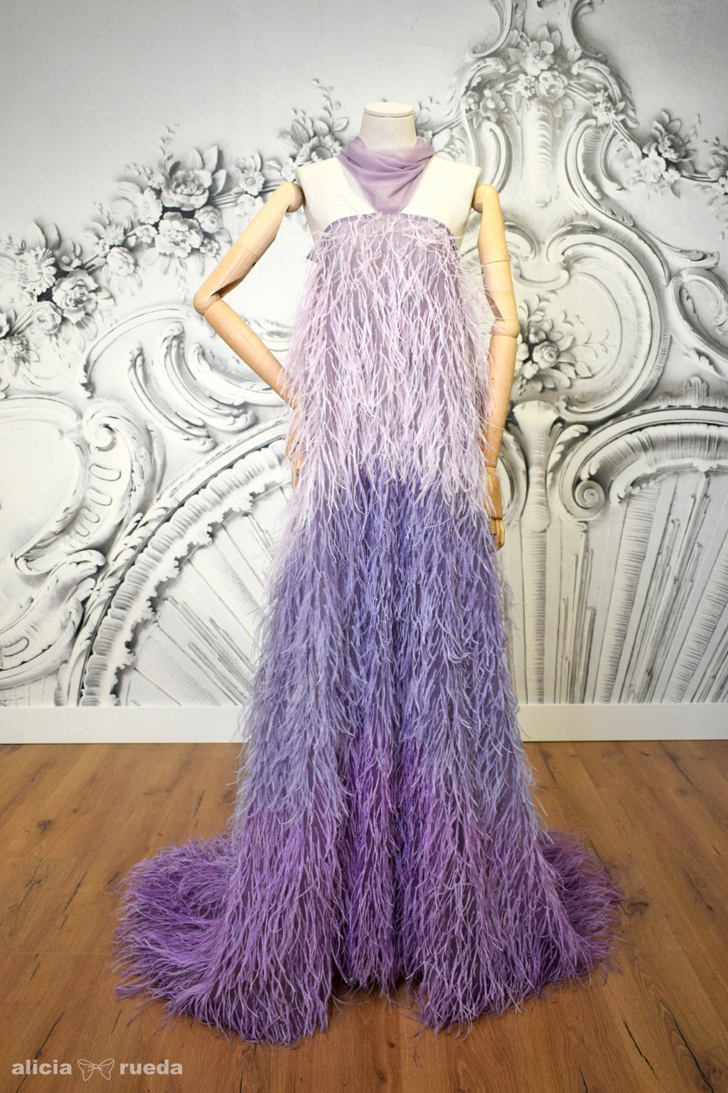 Vestido confeccionado en  pluma con cuello halter y espalda descubierta.