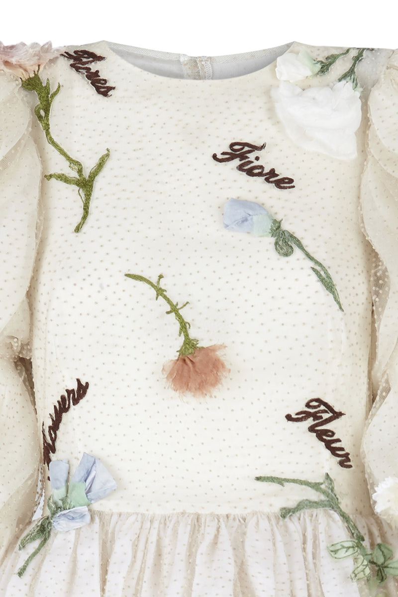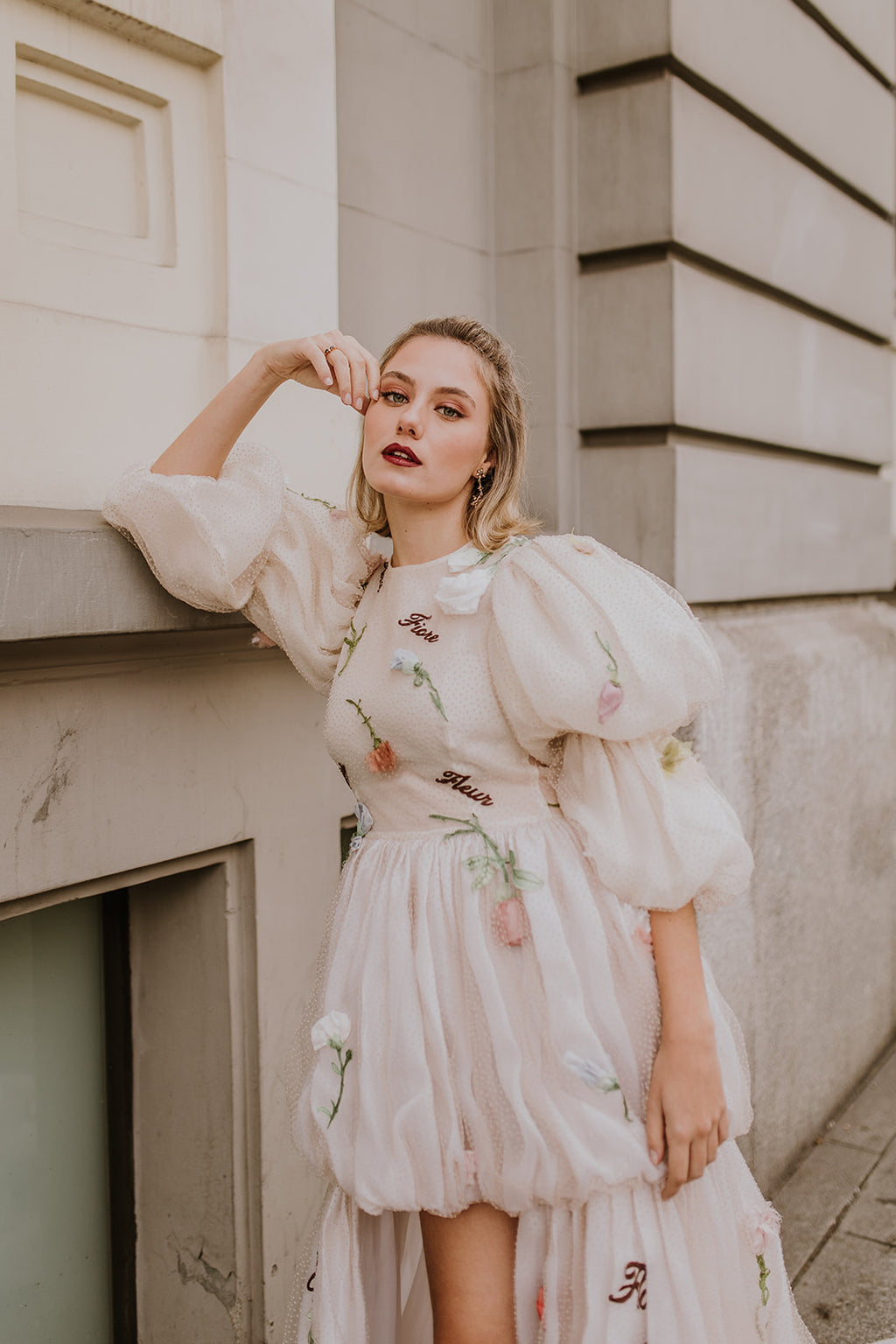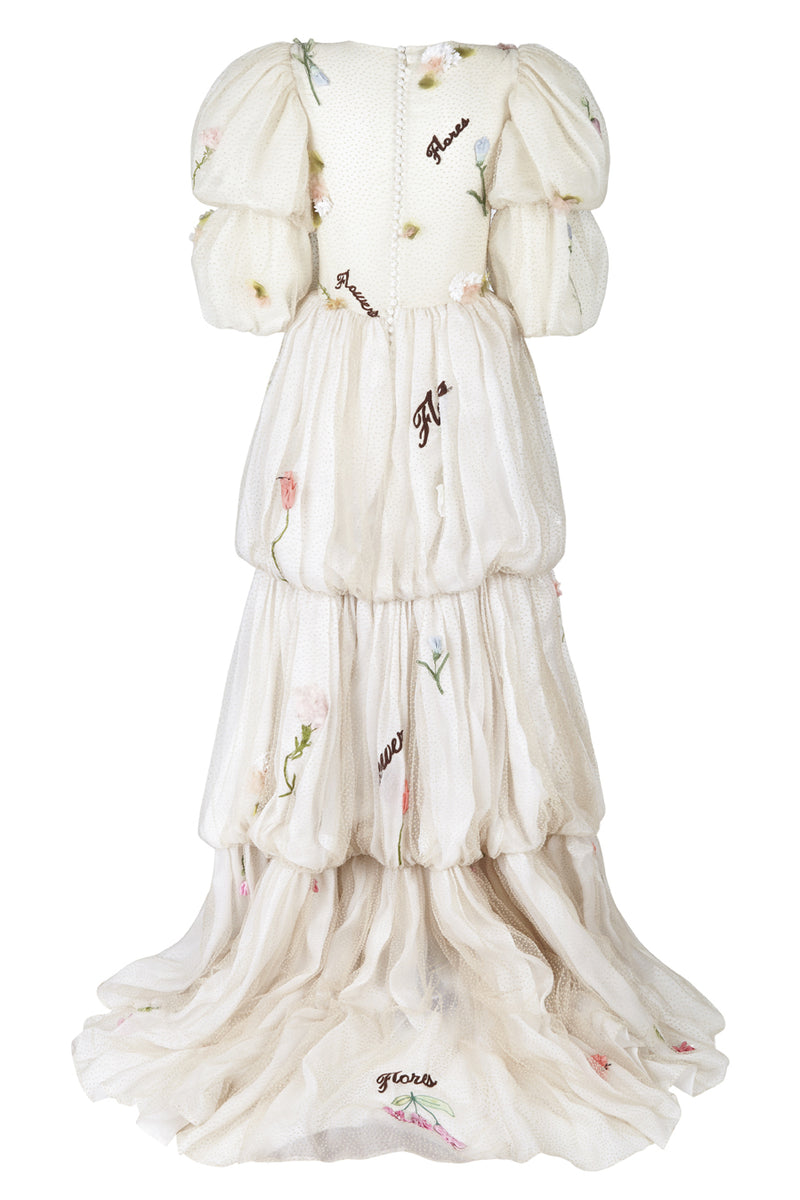Vestido corto por delante y largo por detrás de mangas abullonadas . Realizado en tul de plumeti flocado y bordado en flores y textos.