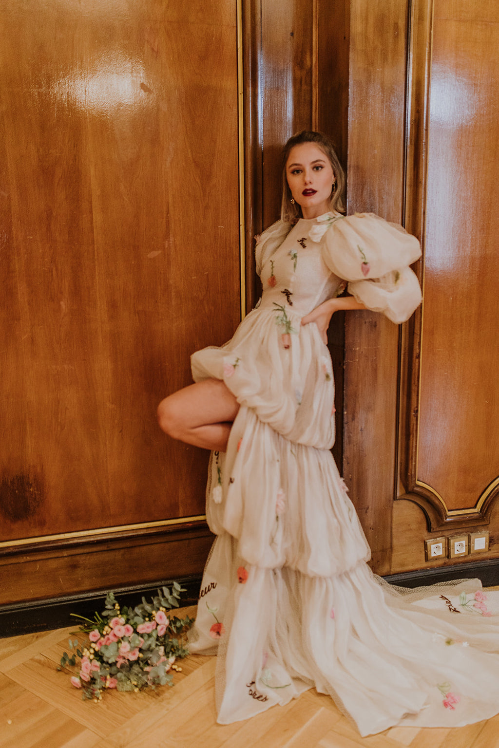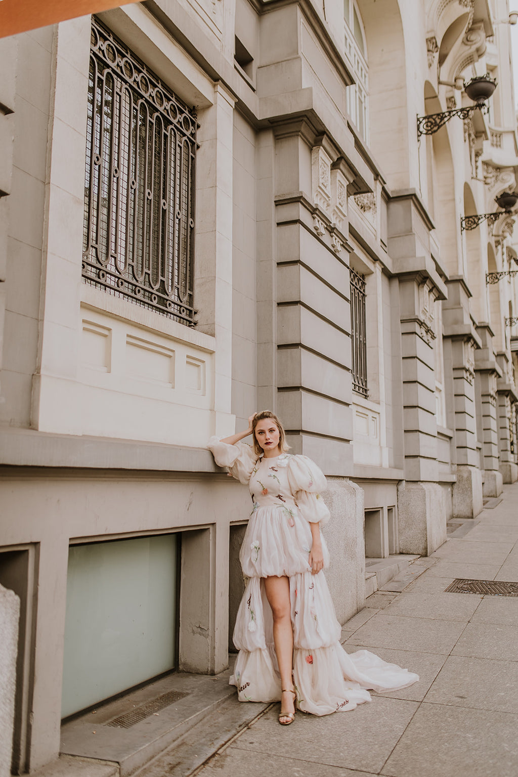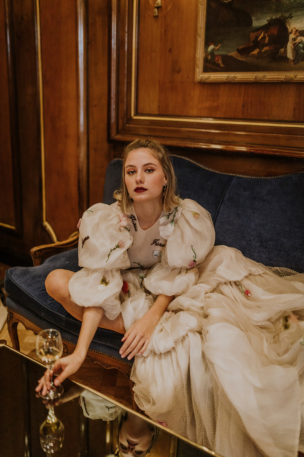 Vestido corto por delante y largo por detrás de mangas abullonadas . Realizado en tul de plumeti flocado y bordado en flores y textos.