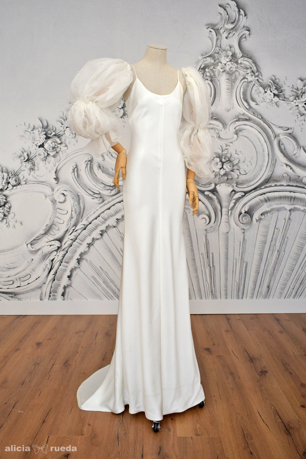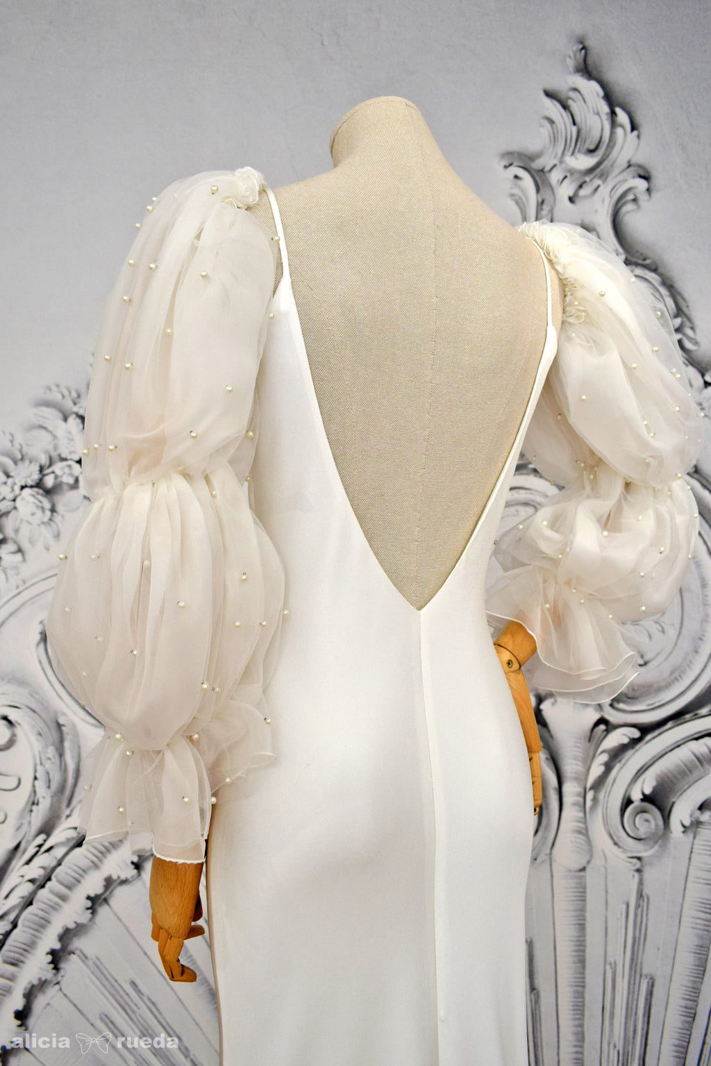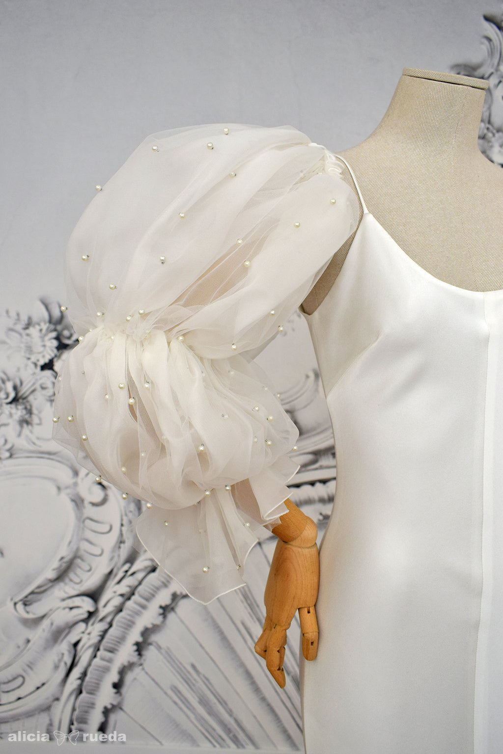 El vestido no viene con las mangas, las mangas abullonadas son independientes confeccionadas en organza de seda con tul bordado de perlas pequeñas.