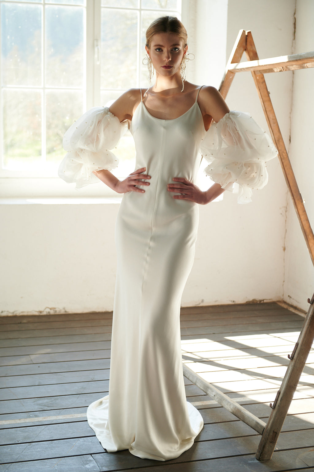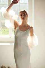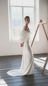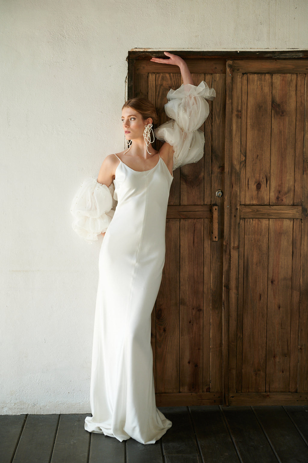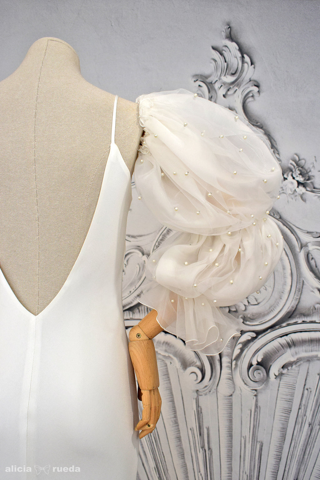 El vestido no viene con las mangas, las mangas abullonadas son independientes confeccionadas en organza de seda con tul bordado de perlas pequeñas.