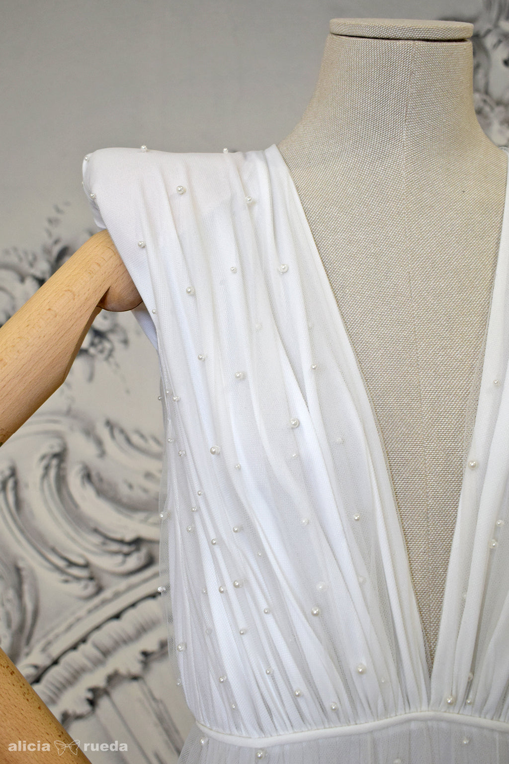 Vestido confeccionado en tul bordado de perlas con corte en cintura, escote en v y hombrera XL.