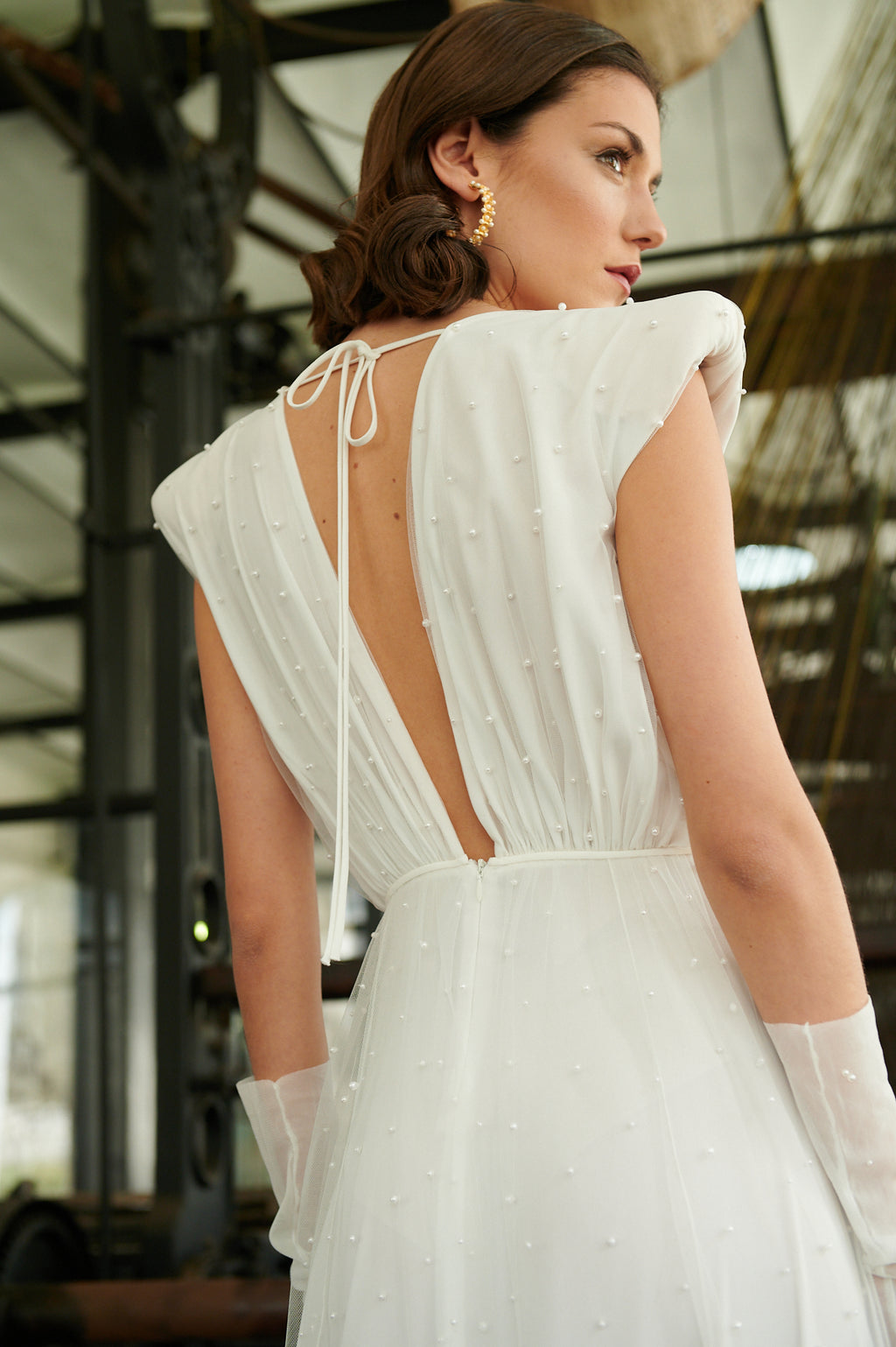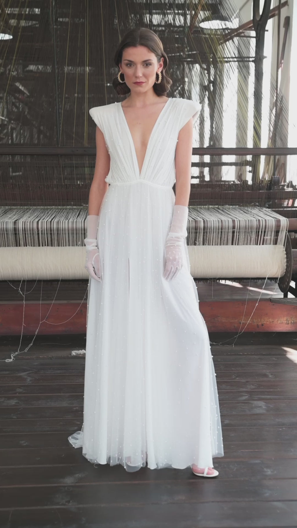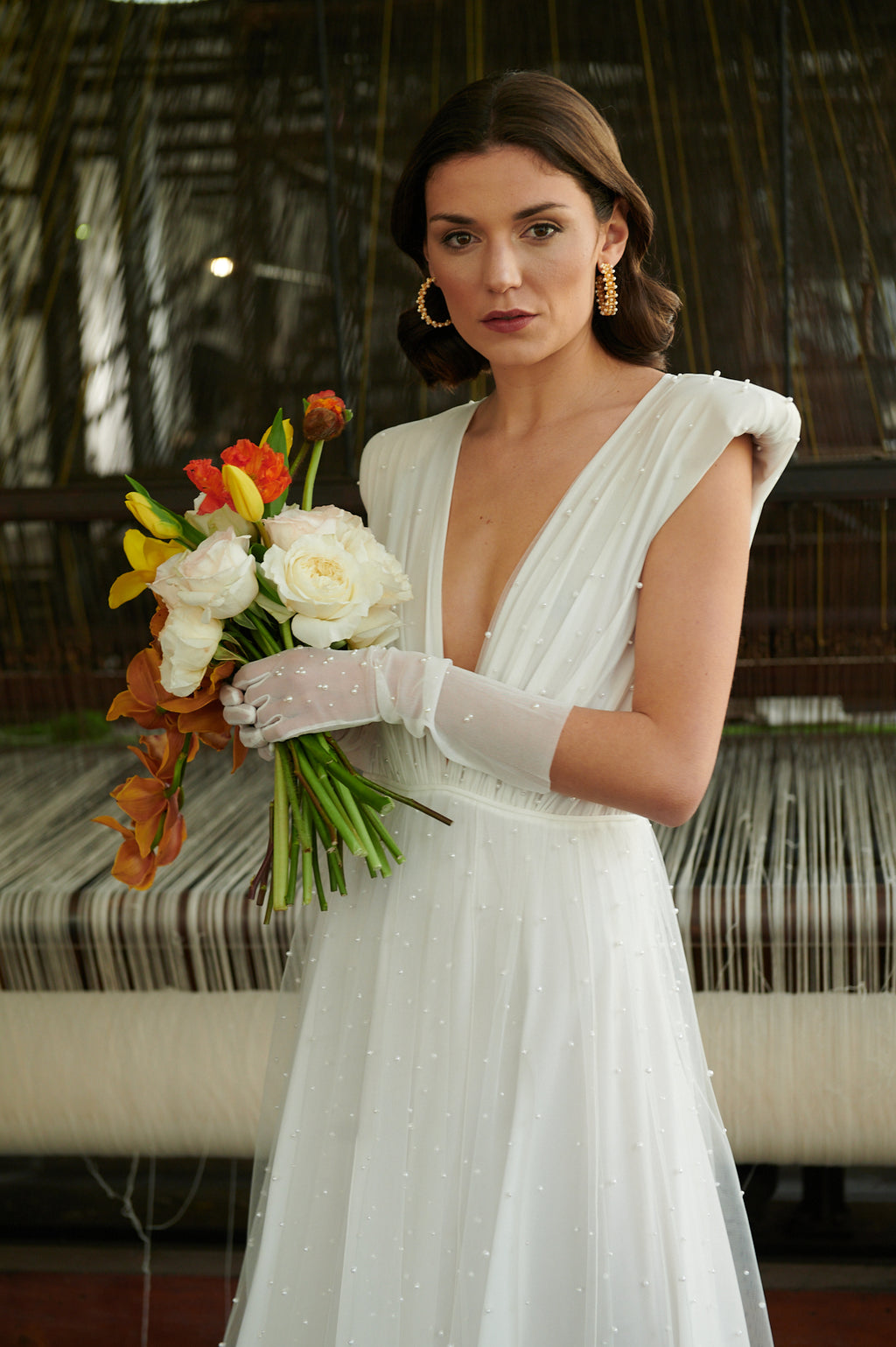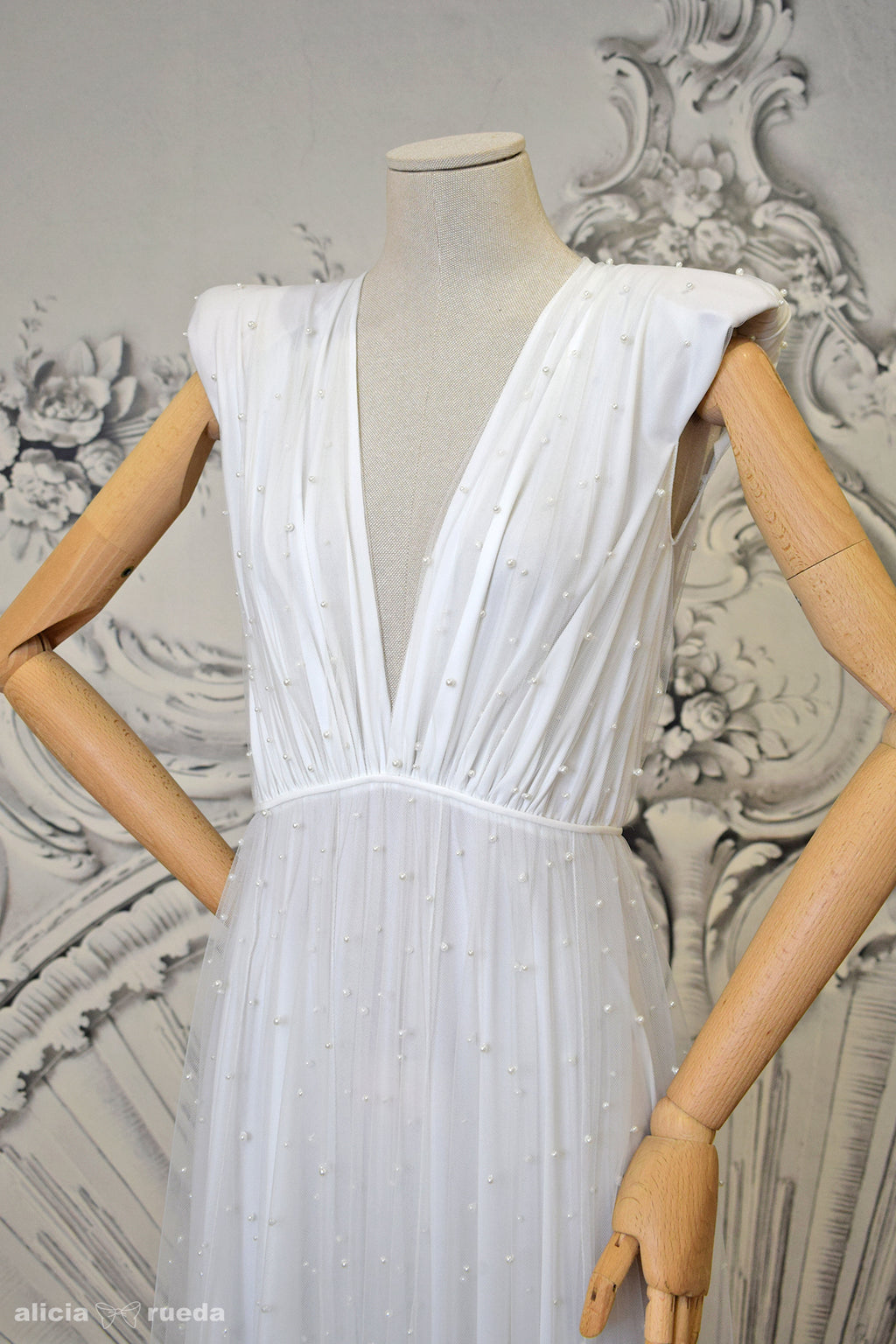 Este vestido se confecciona a medida en nuestro taller. Tras finalizar la compra del modelo, nuestro equipo se pondrá en contacto telefónico y vía email contigo para explicarte el funcionamiento de todas las medidas y tallas, que podrás encontrar debajo del producto. El objetivo es recoger las 12 medidas que necesitamos para crear el vestido de tus sueños.