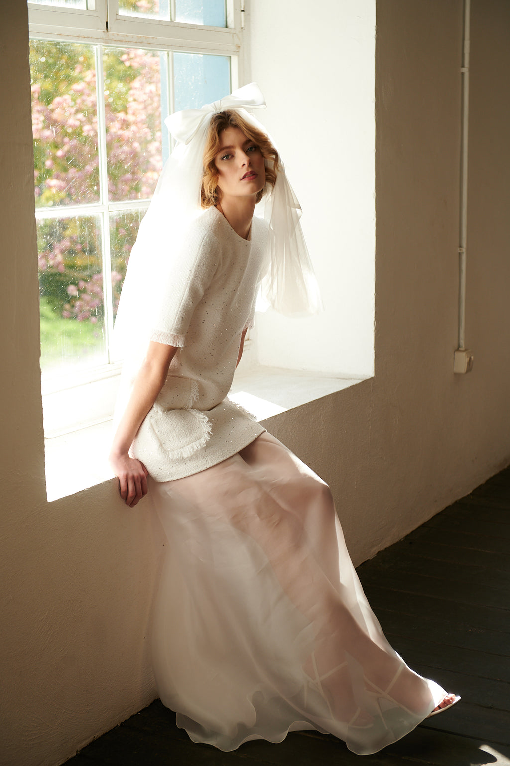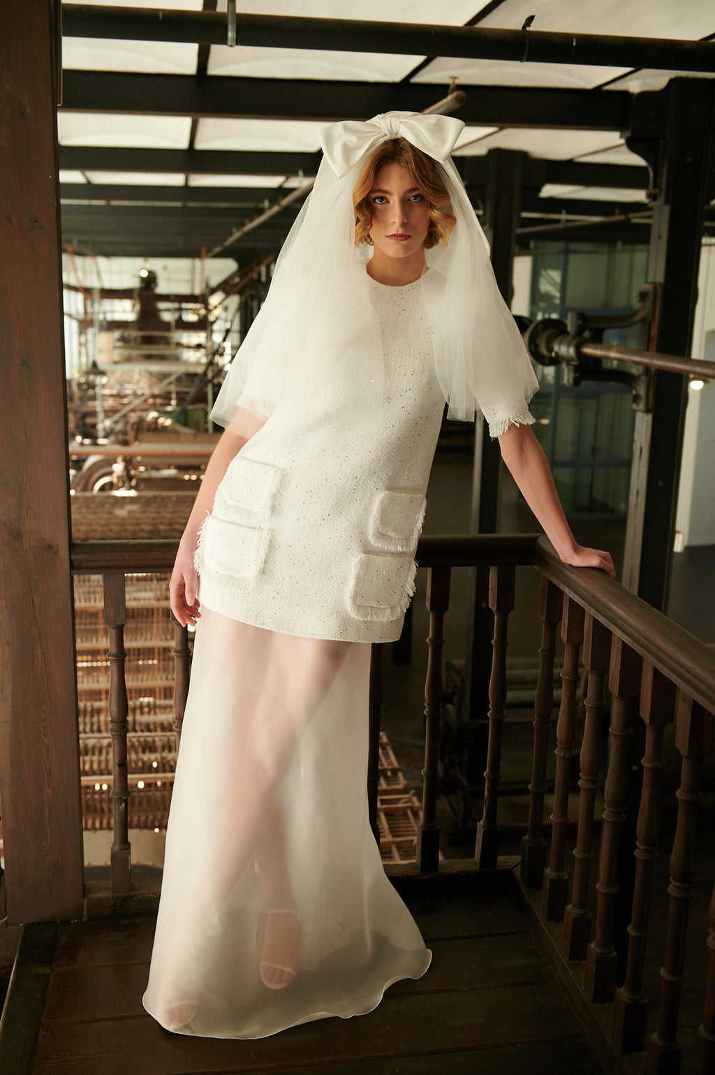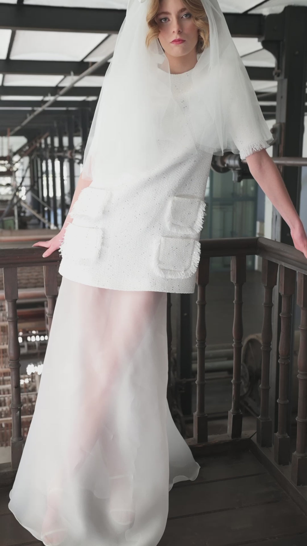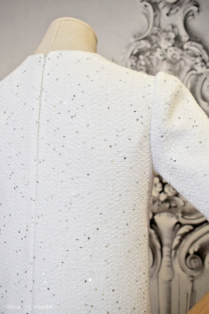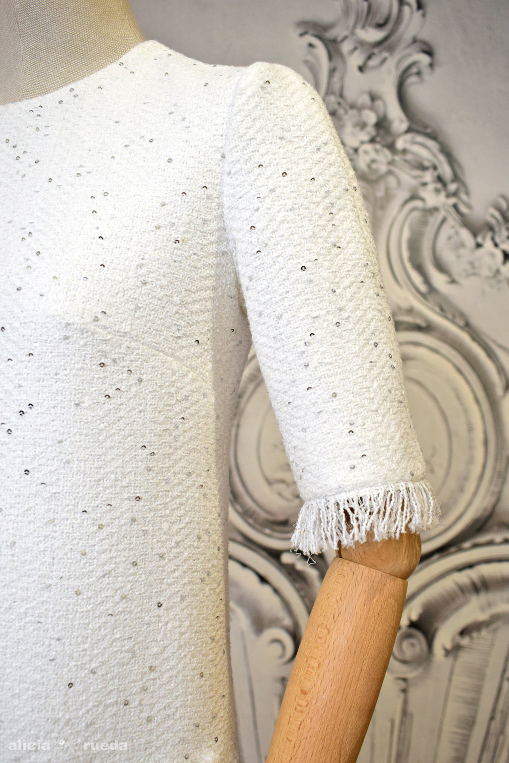 Mini Vestido confeccionado en tejido Chanel con incrustaciones de lentejuela plateada, con opción de falda de organza interior.