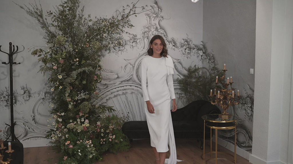 Vestido recto de largo midi, de manga larga, realizado en crep con lazada y caí1da en lado