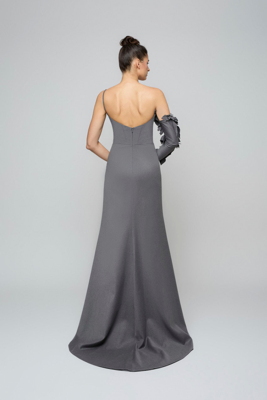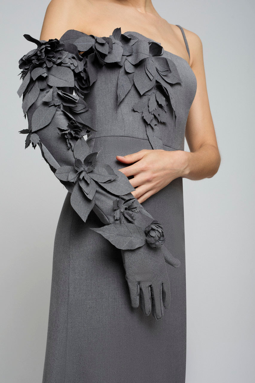 Vestido largo efecto sirena, escote recto con tirante fino, crea un efecto palabra de honor, con guante y flores 3D elaboradas artesanalmente en tono gris marengo.