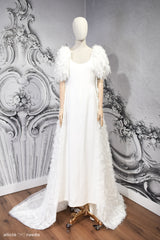 Capa realizada en gasa de flecos de hilo geométrico y organza con manga abullonada .