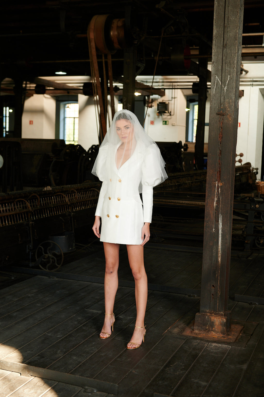 Vestido con manga abullonada confeccionado en tejido mikado y botones joya.