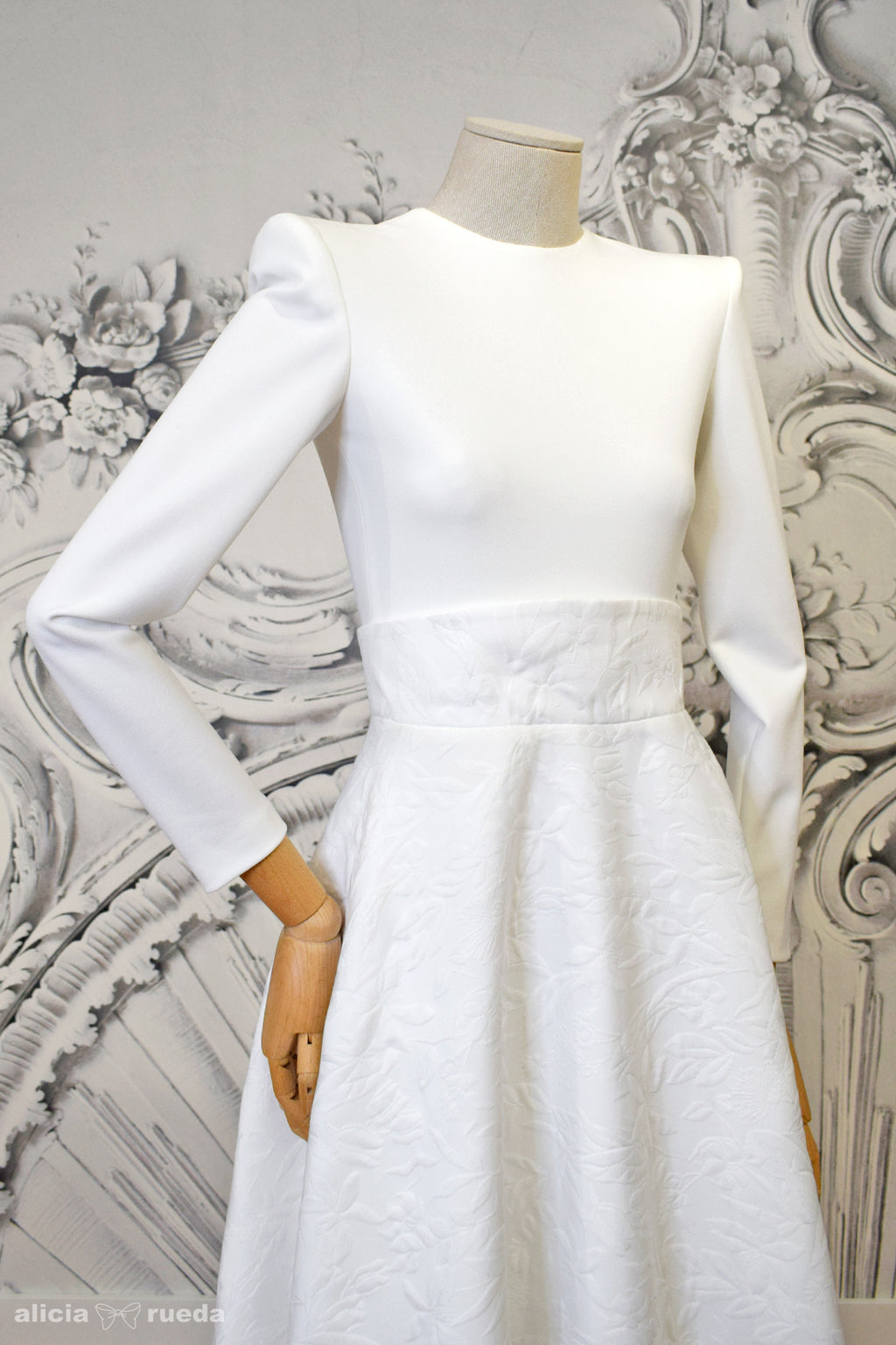 Vestido confeccionado en punto de crep elástico y falda brocada.