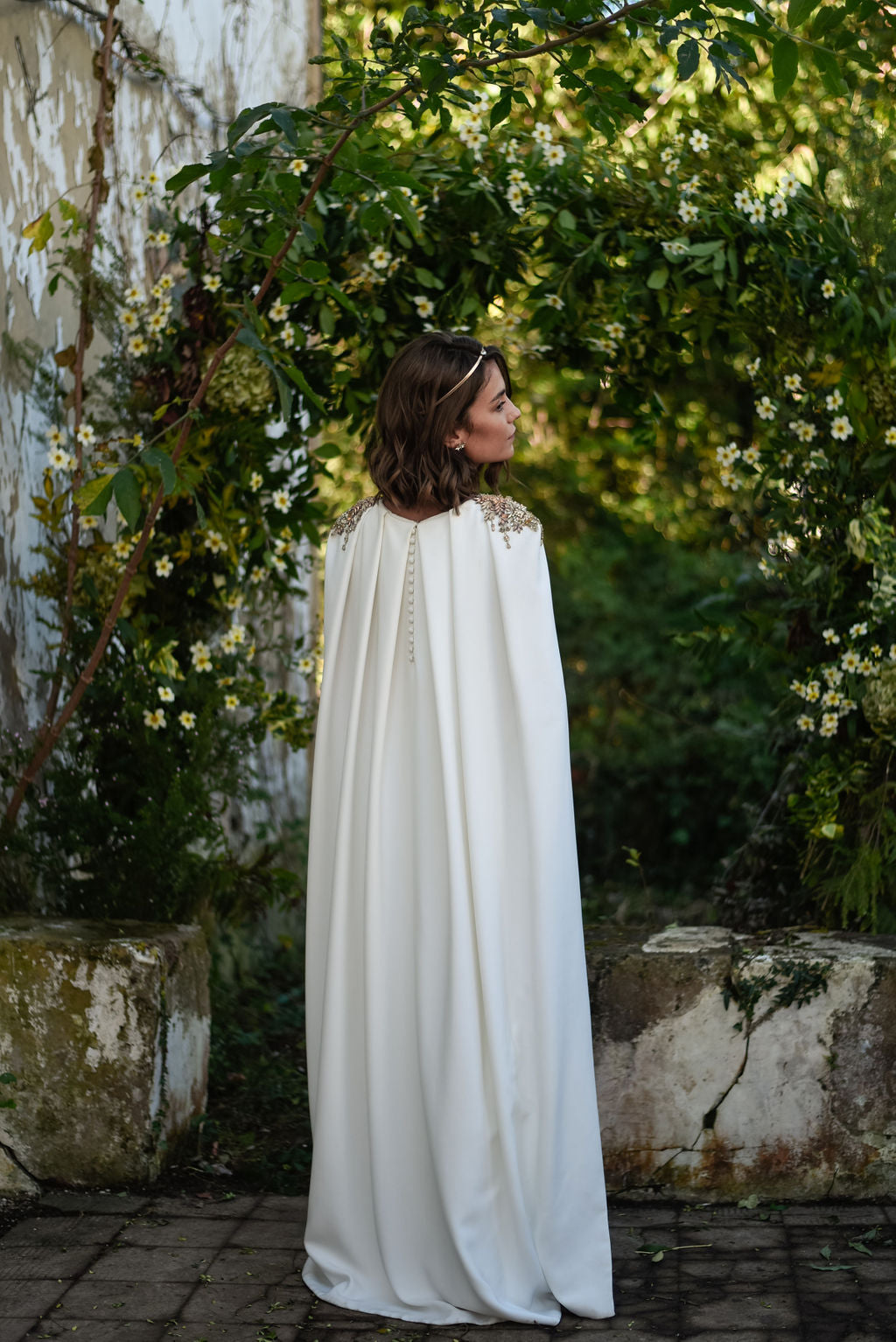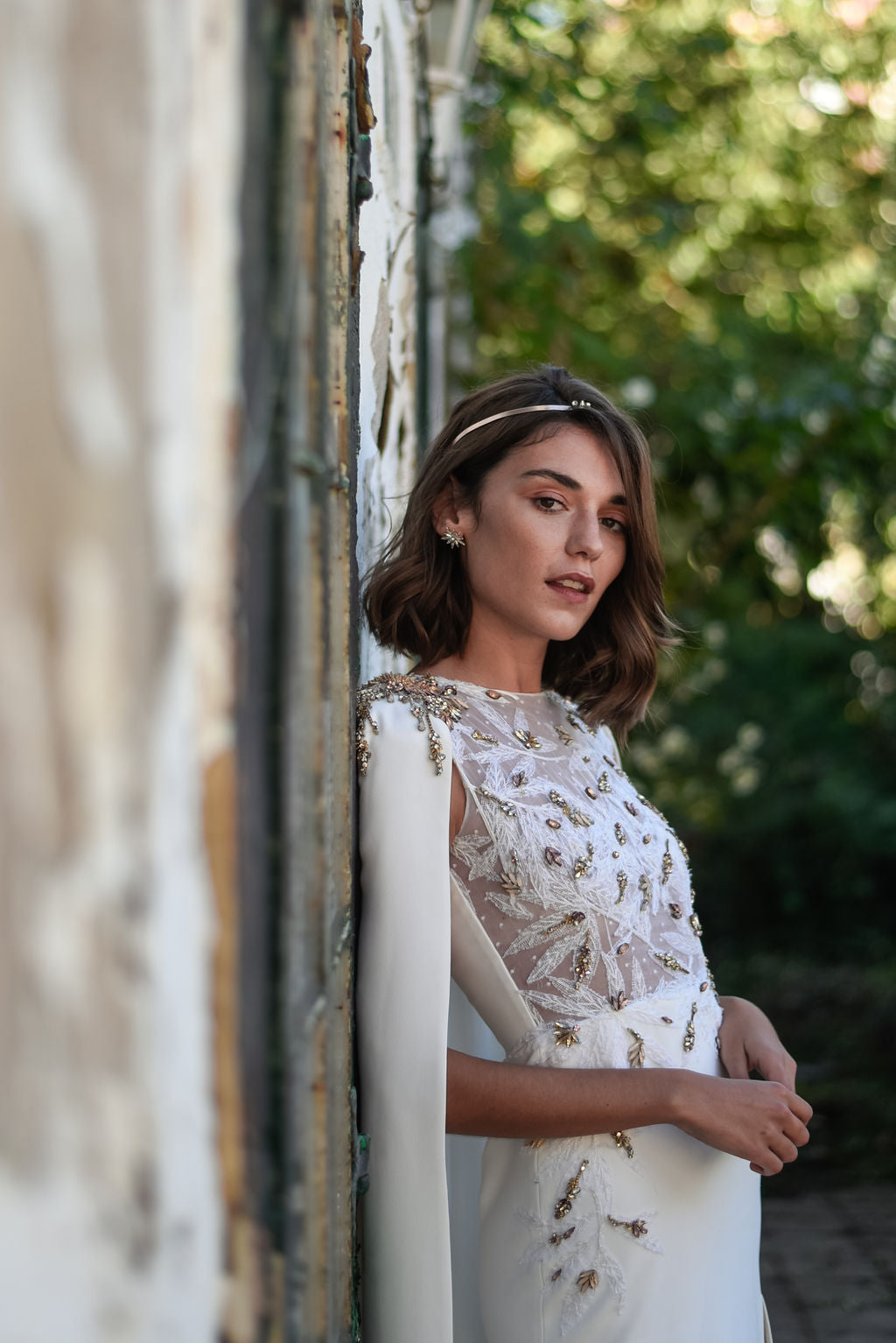 Vestido Capa realizado en crep y tul bordado en hojas, con bordados posicionados de pedrería en hombro delantero y capa interior en tonos dorados y nudé.
