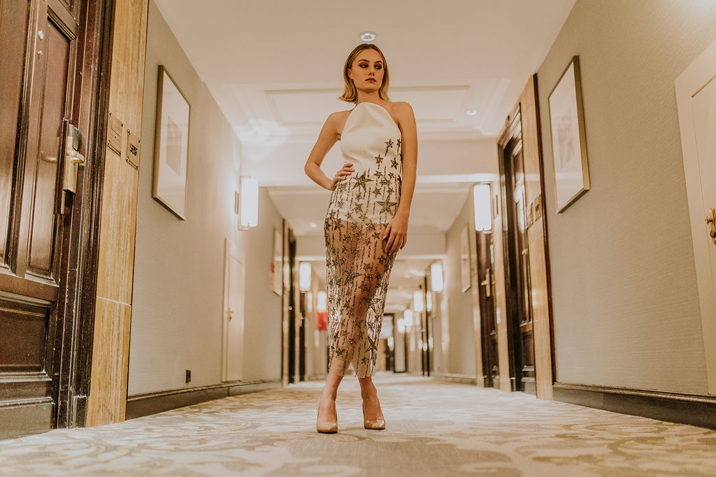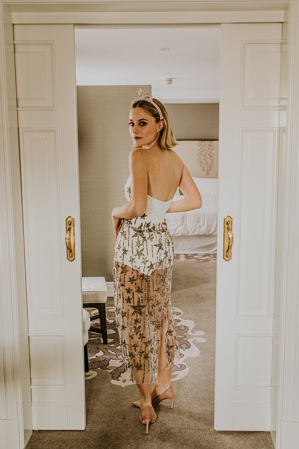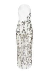 Vestido body palabra de honor con forma curva en escote. La falda confeccionada en tul bordado en pedrería de estrellas .