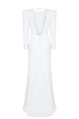 Vestido largo con hombros estructurados, manga larga y espalda descubierta. Detalle de pedrería en la parte superior. Cierre trasero abotonado.