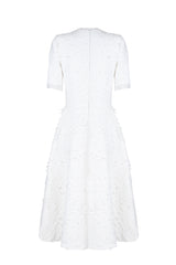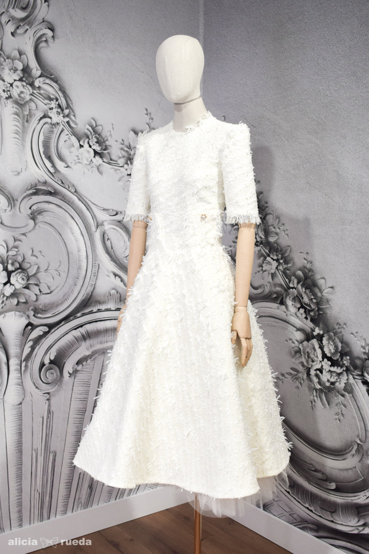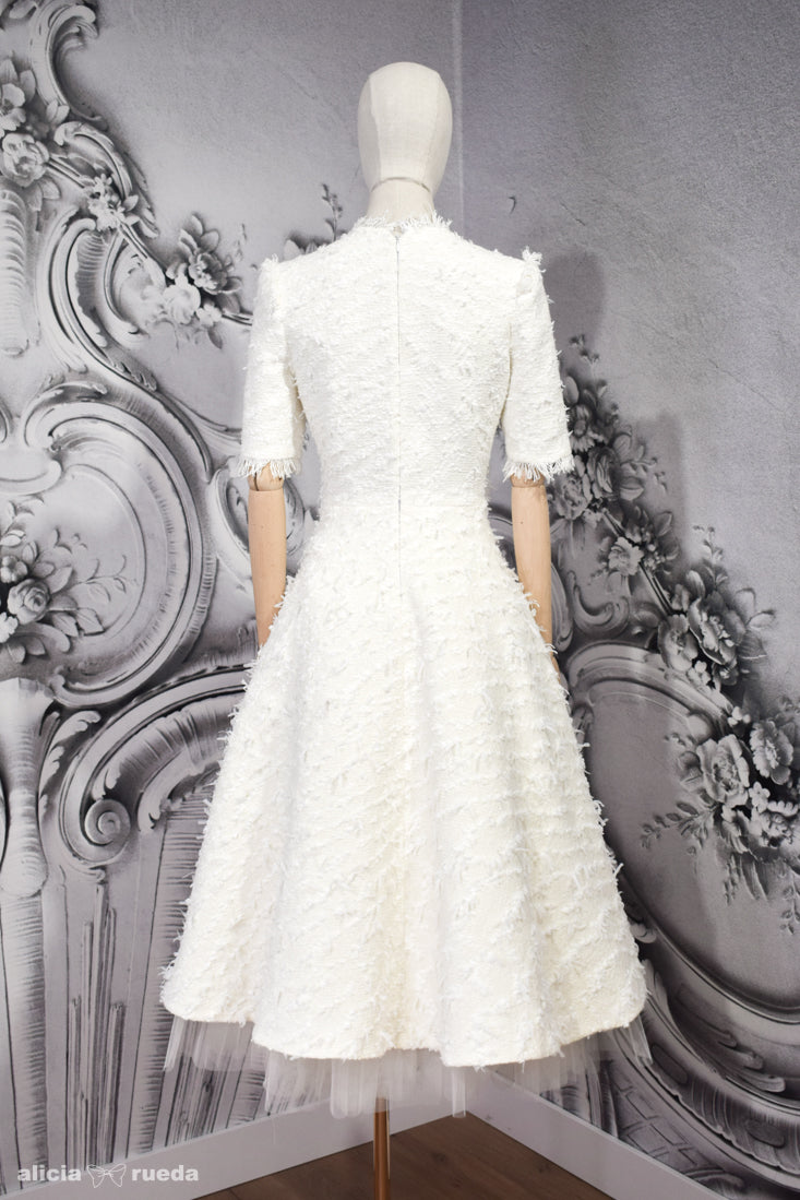 Vestido realizado en tejido chanel , manga francesa y detalle botón joya. Con opción de can can.